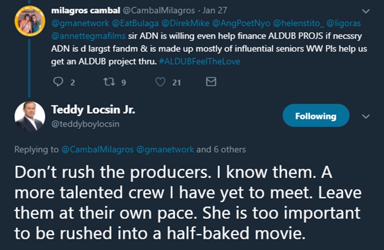 However, Teddy Locsin Jr. said that the fans should be patient and don’t rush things because it is not worth for the AlDub to be in a half-baked movie.