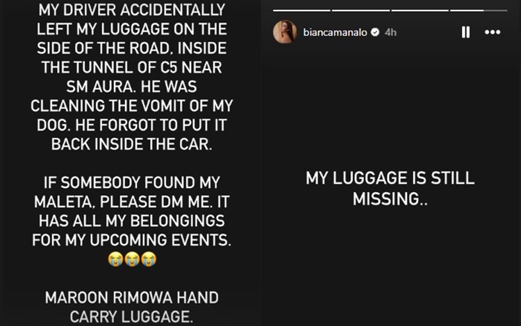Actress and beauty queen Bianca Manalo finds herself in an unexpected predicament as she appeals to the public for assistance in locating her misplaced suitcase. The incident unfolded when her driver inadvertently left the luggage unattended on the side of the road in Taguig. Taking to her Instagram page on Friday, Feb. 23, Manalo reached out to her followers, imploring for any information that might lead to the recovery of her belongings.
