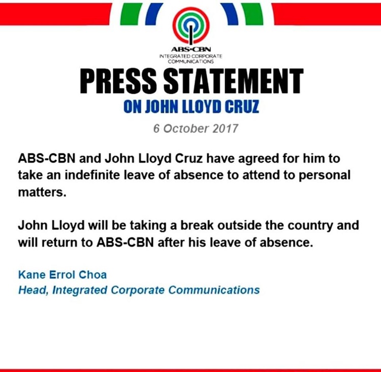 In the press statement, it was said the the Kapamilya network and John Lloyd Cruz agreed on his indefinite leave of absence for his personal matters.