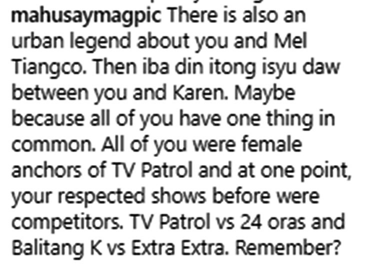 Meanwhile, Korina Sanchez posted her photo with Karen with this caption: “I guess urban legend can indeed precede reality. Karen and I have worked in ABSCBN together for decades. And there is no issue whatsoever.”