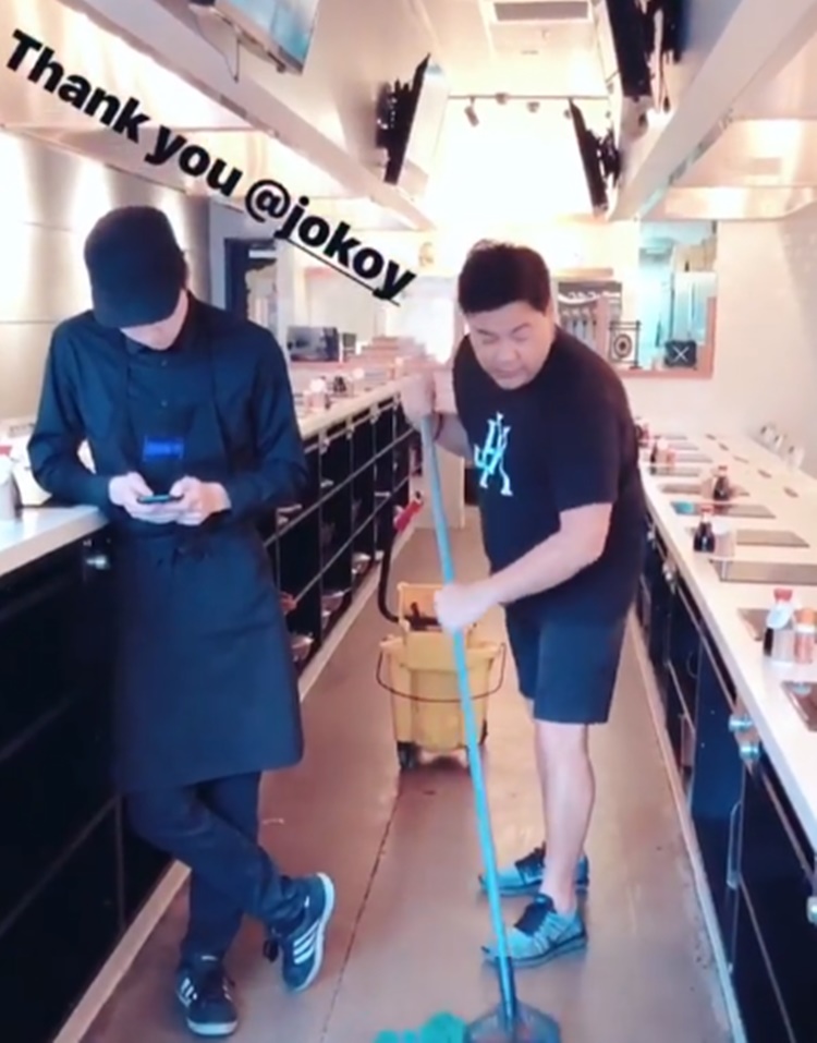 The Concert King showed that he was mopping the kitchen floor while a crew of the restaurant was just standing near him and looked so busy in using his phone.