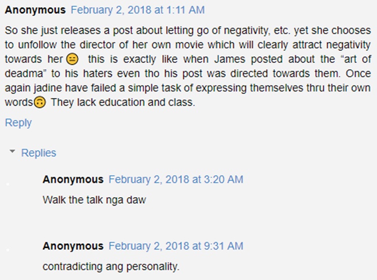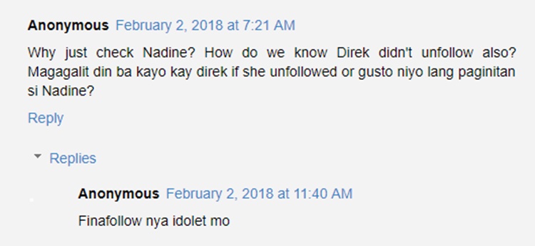 One netizen questioned what if it was the other way around; the director was the one who unfollowed Nadine Lustre but another netizen answered that Jadaone is following the actress on Instagram.