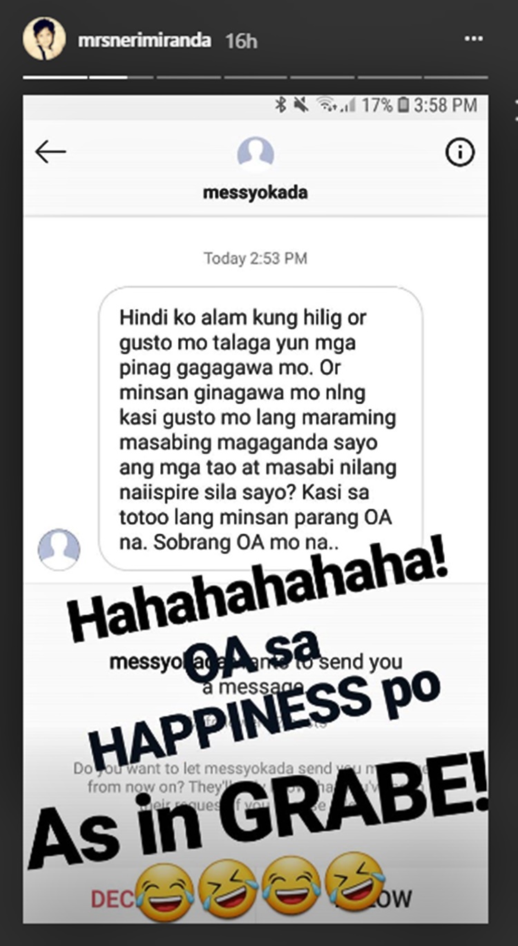 Neri Miranda fired back to two netizens who said in an Instagram direct message to her that she is “OA” or “over acting”