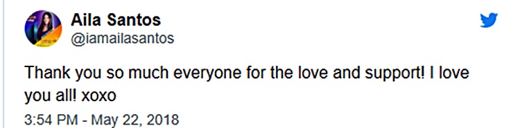 Aila Santos, on the other hand, thanked all her supporters on her Twitter account.