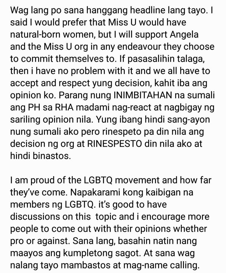 Wyn also iterated that she is respecting the decision of the Miss Universe Organization and she is willing to support Angela Ponce but that does not mean she no longer has the right to express her views.