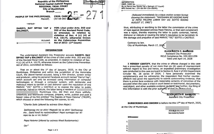 The charges stemmed from a teaser of Yap’s film, “The Rapists of Pepsi Paloma,” released on January 1. The teaser included a scene where Gina Alajar’s character, portraying veteran actress Charito Solis, asked the actress playing Pepsi Paloma if she had been raped by actor-host Vic Sotto. The character replied, “yes.”