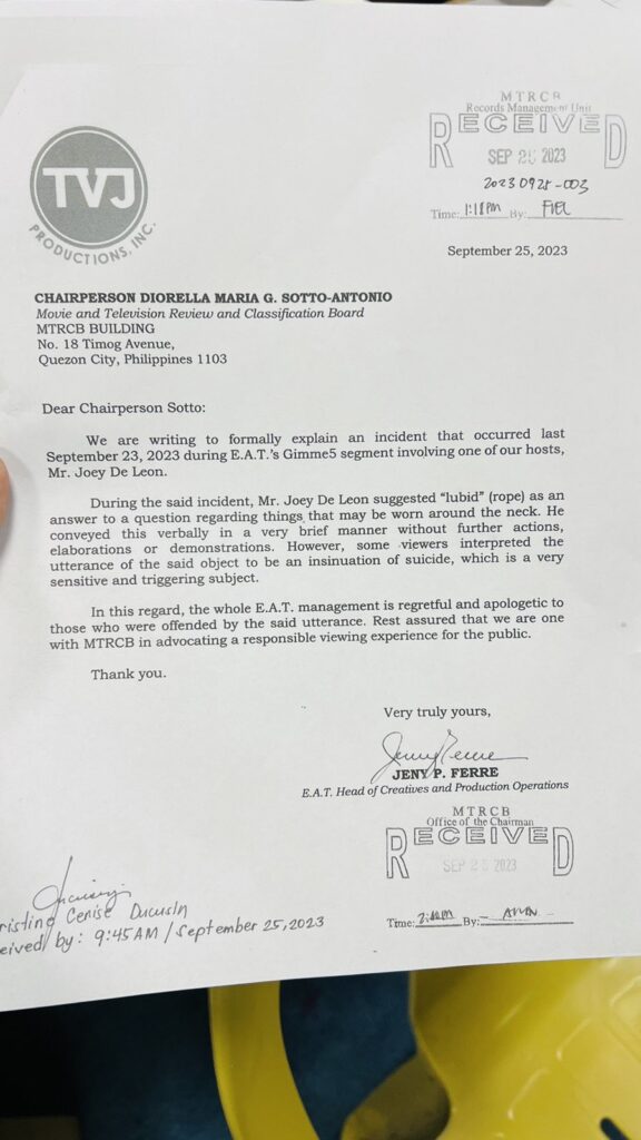 Today, EAT production has released a letter of apology addressed to MTRCB chair Lala Sotto.
