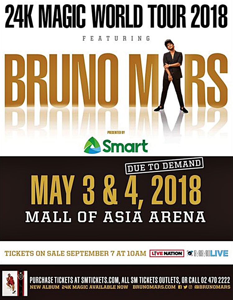 Yes, Bruno Mars is back in the Philippines! Due to demand from his fans, he is set to have a show again at the Mall of Asia Arena on May 3 and 4.