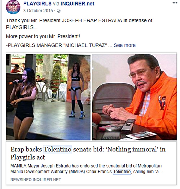 Reportedly, the master of ceremony of that event said that the performance of the ‘Playgirls’ was a surprise gift from defeated Senatorial candidate Francis Tolentino who was also a former MMDA chairman.