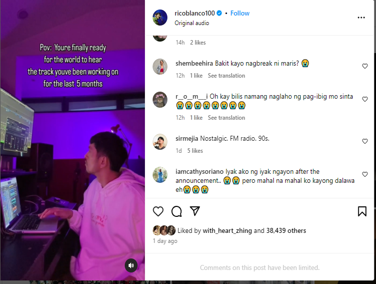 Additionally, Rico uploaded another video on Instagram that further fueled speculation. The video, captioned “POV: You’re finally ready for the world to hear the track you’ve been working on for the last 5 mos,” featured the melody of the song “Kisapmata” in the background. The lyrics, “O kay bilis naman maglaho ng pag-ibig mo sinta daig mo pa ang isang kisap mata,” resonated deeply with netizens, drawing a connection between the song and the suddenness of his breakup with Maris.