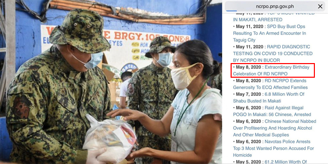 As posted on the NCRPO website, it detailed on how Police Major General Debold Sinas celebrated his birthday last May 8 through NCRPOs’s relief operations to the poor communities in the National Capital Region amid the coronavirus pandemic. However, Sinas’ controversial mañanita — which was already a subject of the investigation — wasn’t included in the list of accomplishments.