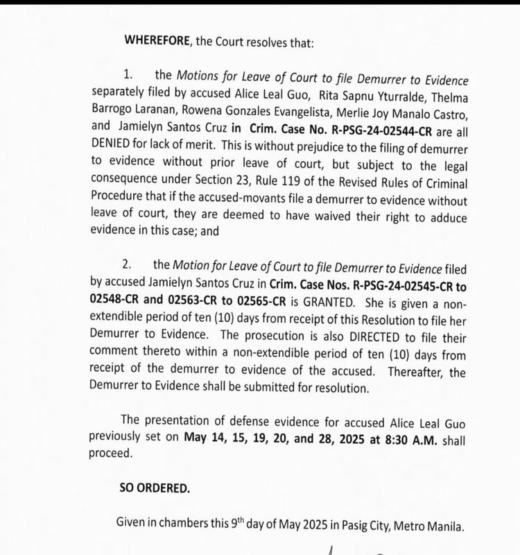 The court has denied the motions for leave to file a demurrer to evidence filed by dismissed Bamban, Tarlac Mayor Alice Guo, and her co-accused during Wednesday’s hearing. The defense typically files a motion for leave to seek court permission to submit a demurrer to evidence, which, if granted, would ask the court to dismiss the case based on insufficient evidence from the prosecution.