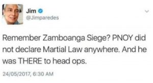 Veteran singer-songwriter Jim Paredes went to the micro-blogging site, Twitter where he expressed his sentiment over Martial Law declaration of President Rodrigo Duterte in Mindanao.