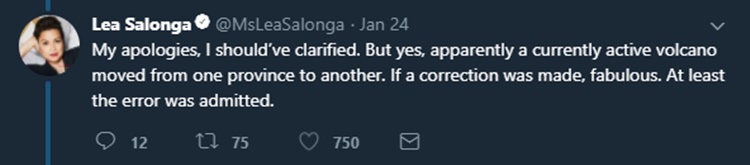Lea Salonga lauded Mocha Uson for admitting her mistake on her previous statement that Mayon volcano is in Naga