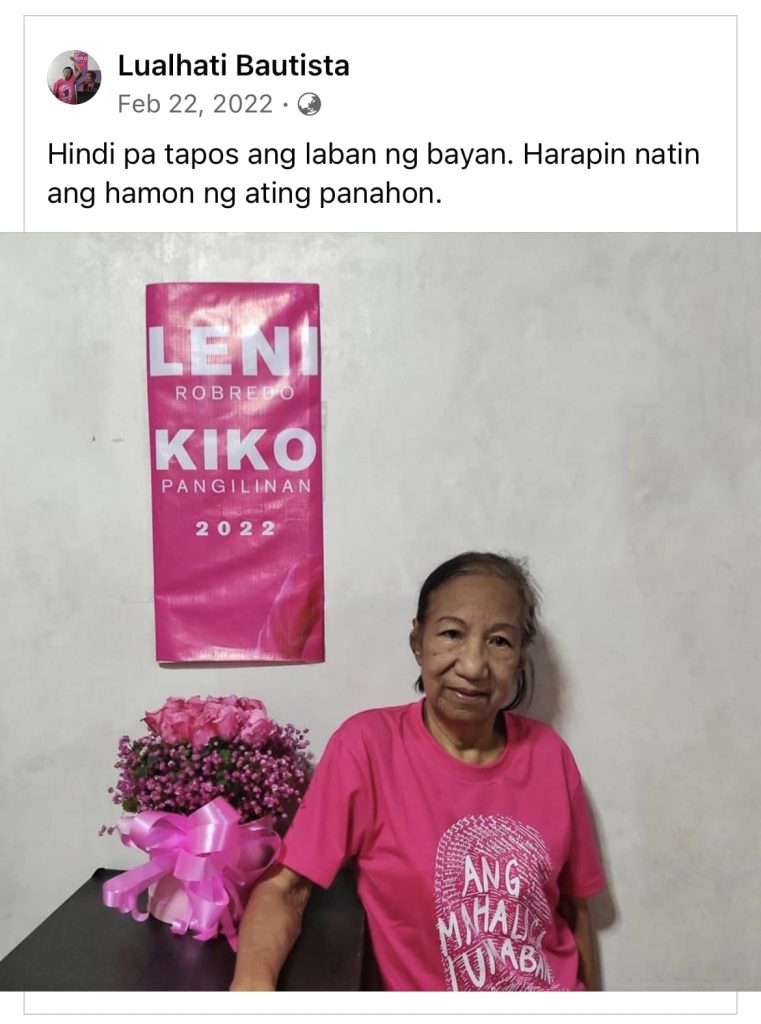 “Isang pagpupugay kay Lualhati Bautista. Maraming salamat, Ma’am, sa pagbabahagi ng sarili, husay, at tapang sa pamamagitan ng inyong buhay at mga akda,” read Robredo’s social media post attached to Bautista’s photo when he formally declared support for his presidential candidacy last February last year.