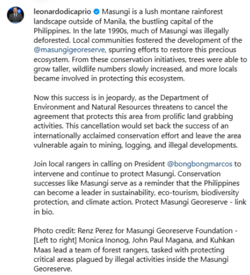 DiCaprio’s plea to President Marcos comes at a crucial time. The actor urged the president to join local rangers and conservationists in their fight to maintain the protection of Masungi. “Join local rangers in calling on President @bongbongmarcos to intervene and continue to protect Masungi,” DiCaprio implored. He underscored the broader significance of such conservation successes, which not only protect the environment but also highlight the Philippines’ potential as a leader in sustainability, eco-tourism, biodiversity protection, and climate action.