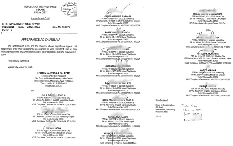 According to Senate Impeachment Court spokesperson Atty. Reginald Tongol, the legal representative of Vice President Duterte, filed their Appearance – Ad Cautelam at exactly 5:03 p.m. on Monday. The document, received by the Secretary of the Senate acting as the Clerk of Court for impeachment matters, confirms that the Manila-based law firm Fortun Narvasa & Salazar will represent the Vice President.