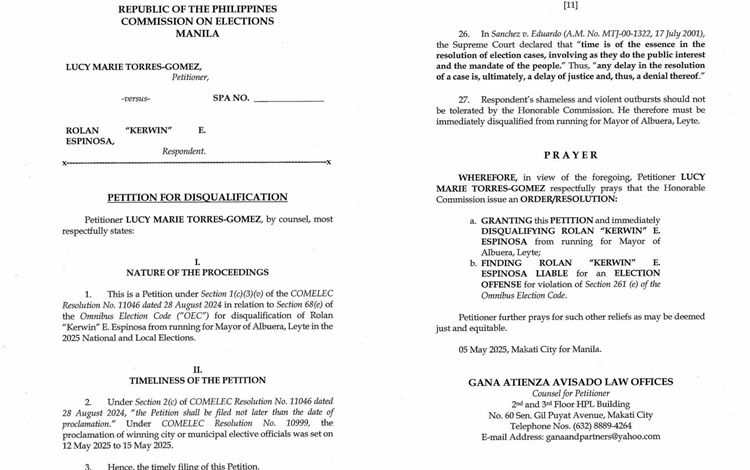 Ormoc City Mayor Lucy Marie Torres-Gomez has officially filed a petition to disqualify Albuera mayoral candidate Rolan “Kerwin” Espinosa, citing violations of the Omnibus Election Code following his controversial Facebook live broadcast.