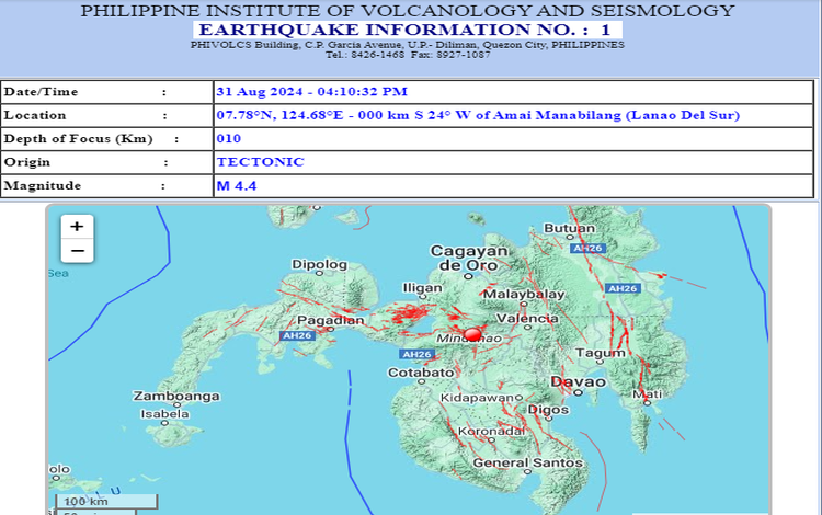 Amai Manabilang, Lanao del Sur – A magnitude 4.4 earthquake shook the town of Amai Manabilang, Lanao del Sur, at 4:10 PM on Saturday, August 31, according to the Philippine Institute of Volcanology and Seismology (Phivolcs).