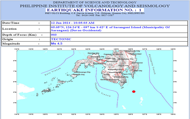 According to the Phivolcs report, the tectonic-origin earthquake took place around 10:05 in the morning. The epicenter was identified at a distance of 97 kilometers southeast of Sarangani Island in the municipality of Sarangani, Davao Occidental, with a depth of 3 kilometers.