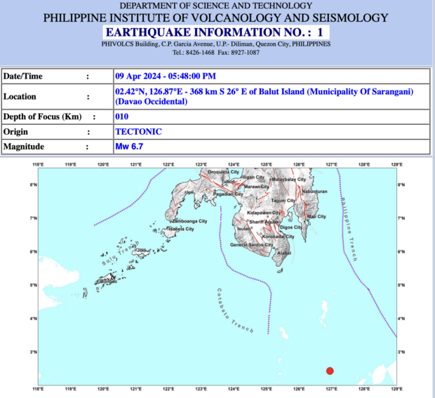 Magnitude 6.7 Quake Strikes Off Balut Island, Davao Occidental