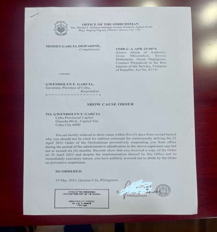 The Office of the Ombudsman has issued a show cause order against Cebu Governor Gwendolyn Garcia for allegedly continuing to defy the preventive suspension imposed on her in April 2024. Ombudsman Samuel Martires stated that despite receiving the order, Garcia has openly refused to comply.
