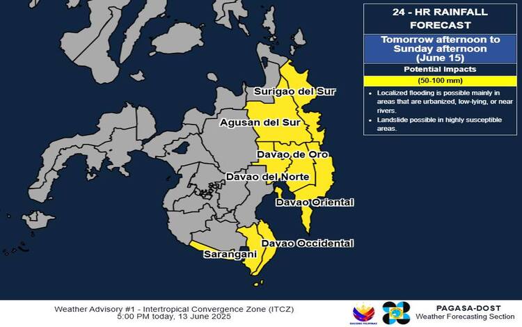 According to PAGASA, rainfall amounts ranging from 50 to 100 millimeters are expected from today until tomorrow afternoon (June 14) over the provinces of Davao Oriental, Davao de Oro, Davao del Norte, Davao City, Davao del Sur, Davao Occidental, Surigao del Norte, Surigao del Sur, Agusan del Norte, Agusan del Sur, Dinagat Islands, Misamis Oriental, Bukidnon, Sarangani, and South Cotabato. From tomorrow afternoon until Sunday afternoon (June 15), continued rains are forecast over Davao Oriental, Davao de Oro, Davao del Norte, Davao Occidental, Surigao del Sur, Agusan del Sur, and Sarangani.