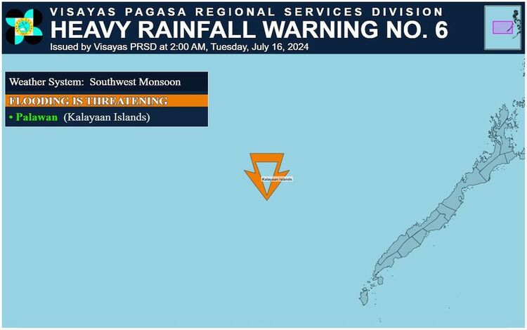 An Orange Warning Level has been issued for Palawan (Kalayaan Islands), indicating that flooding is threatening in low-lying areas and landslides are possible in mountainous regions. The public, along with the disaster risk reduction and management council, are advised to take appropriate actions, monitor the weather conditions closely, and await the next advisory, scheduled for release at 5:00 AM.