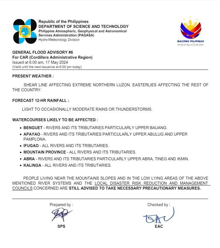 - CAR (Cordillera Administrative Region): Flood advisory GFA#6 remains in effect.