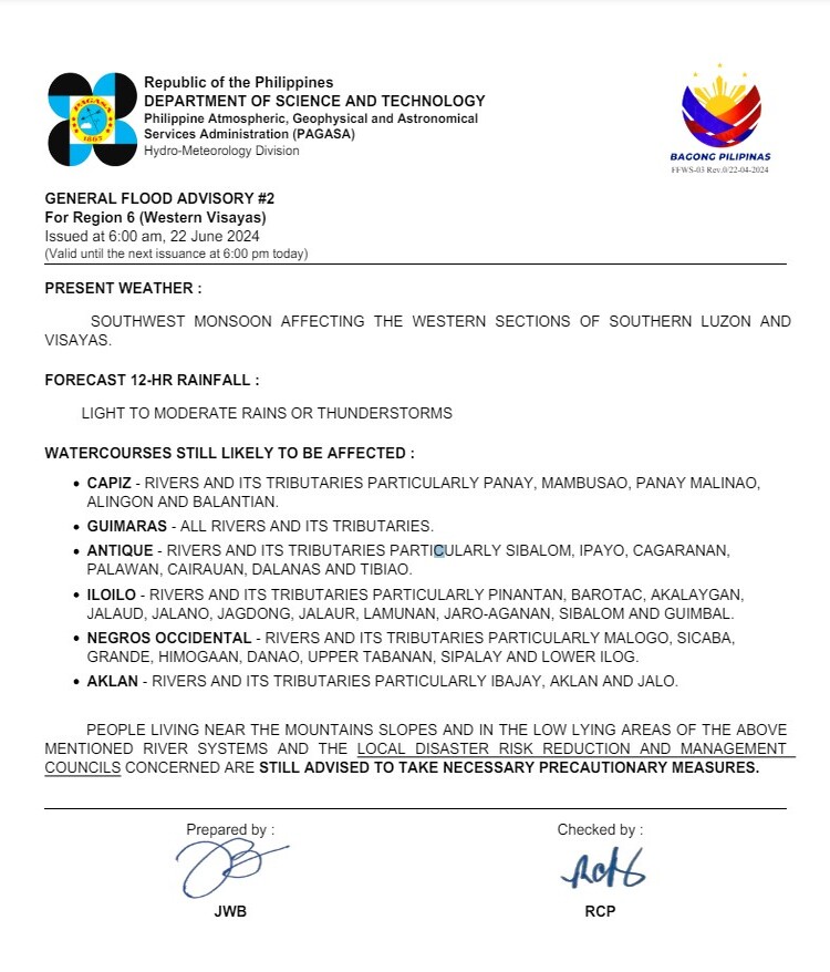 General Flood Advisories (Issued at 6 AM, June 22, 2024): PAGASA has issued flood advisories for the following regions: