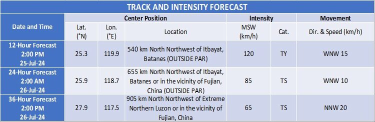 Issued at 5:00 AM on 25 July 2024, Typhoon Carina is currently crossing Taiwan and nearing the northern boundary of the Philippine Area of Responsibility (PAR). As of 4:00 AM, the center of the typhoon was located approximately 465 km north of Itbayat, Batanes, near Hsinchu County, Taiwan. It is moving northward at 20 km/h, with maximum sustained winds of 150 km/h near the center, gustiness up to 250 km/h, and a central pressure of 960 hPa.