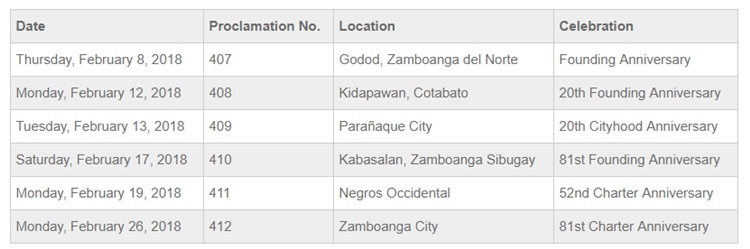 Malacañang Palace declared February 8, 12, 13, 17, 19 and 26, 2018 as special non-working holidays in selected areas.