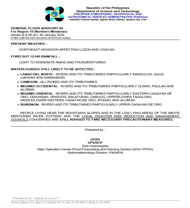 General Flood Advisories (Issued @6AM, 30 January 2024):
