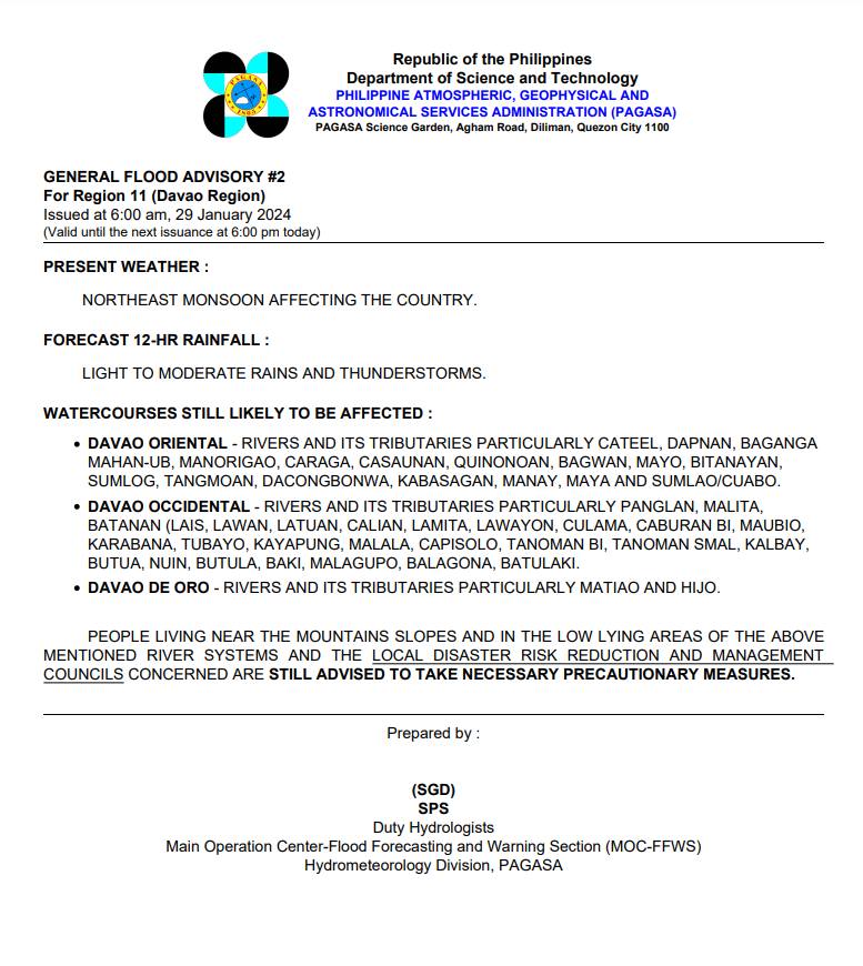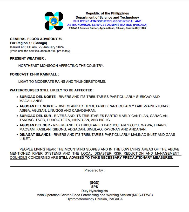 General Flood Advisories (Issued @6 AM, 29 January 2024):