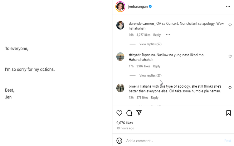 Jen has not responded further to the ongoing criticism, but her name continues to trend on social media, with many calling for accountability from influencers who attend public events. Despite the controversy, the concert was a massive success for Olivia Rodrigo, whose Filipino fans showed their overwhelming support throughout the night.