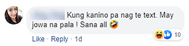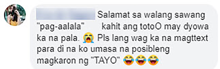 Salamat sa walang sawang ‘pag-aalala’ kahit ang totoo may jowa ka na pala. Please lang wag ka na magte-text para hindi na ako umasa na posibleng magkaroon ng ‘tayo’” a netizen wrote in comments.