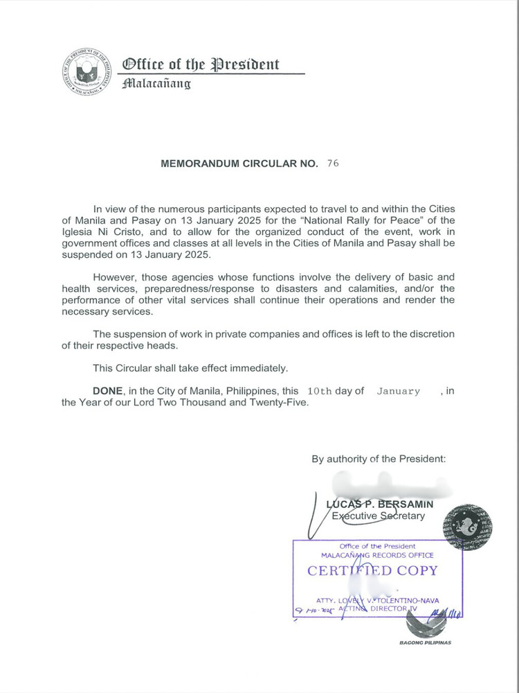 On January 13, 2025, Malacañang announced the suspension of work in government offices and classes at all levels in Manila and Pasay City in observance of the Iglesia Ni Cristo’s “National Rally for Peace.” The rally, organized by the religious group, is expected to gather thousands of participants promoting peace and unity across the nation.
