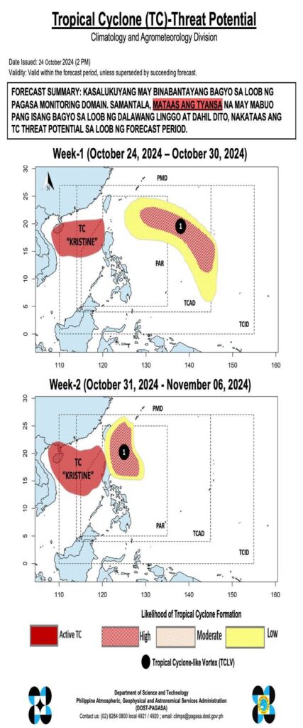 Currently, there is a tropical cyclone being monitored within PAGASA’s monitoring domain. Meanwhile, there is a high chance that another tropical cyclone will develop within the next two weeks. Due to this, the Tropical Cyclone Threat Potential is elevated during the forecast period.