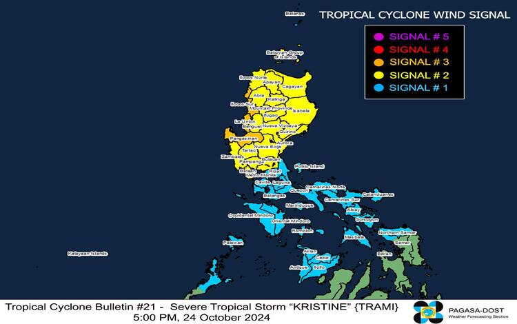 Pagasa has raised Tropical Cyclone Wind Signals (TCWS) over various regions as Kristine threatens the country: