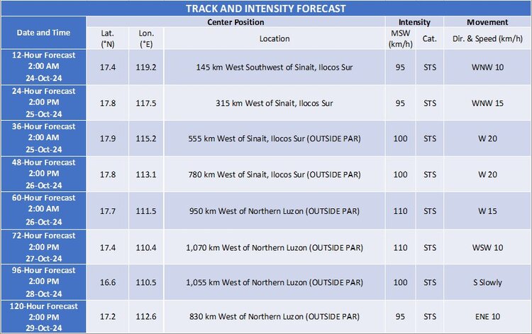 Kristine is forecast to continue moving westward and exit the Philippine Area of Responsibility (PAR) by tomorrow afternoon, October 25. However, Pagasa is closely monitoring its development, as there is a possibility the storm could intensify further and loop back towards the country. Another weather disturbance is being watched east of PAR, which may develop into a tropical depression within the next 24 hours.