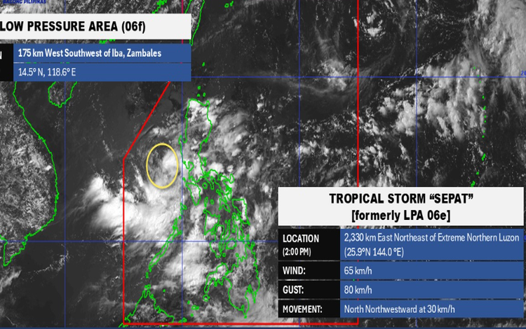 As of 3:00 PM, the LPA was located approximately 185 kilometers west of Cubi Point, Subic Bay International Airport (14.5°N, 118.6°E). Although still outside the Philippine Area of Responsibility (PAR), Tropical Storm SEPAT (international codename 2407) was also monitored at 2,315 kilometers east-northeast of Extreme Northern Luzon. It has maximum sustained winds of 65 kilometers per hour and gusts of up to 80 kilometers per hour, moving north-northwestward at 30 kilometers per hour.