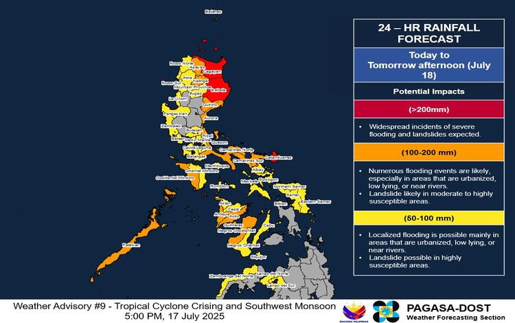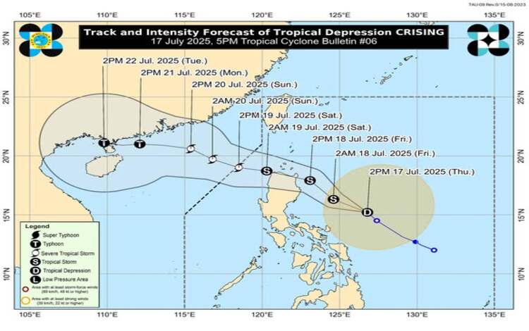 MANILA, Philippines – July 17, 2025. The Philippine Atmospheric, Geophysical and Astronomical Services Administration (PAGASA) has issued its latest 5 PM advisory on Tropical Cyclone Crising, warning of widespread heavy rainfall over several parts of the country from today until Sunday, July 20. The effects of Crising are further intensified by the southwest monsoon (habagat), which is expected to bring torrential rains across Luzon, Visayas, and parts of Mindanao.