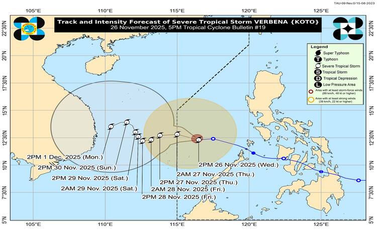 Severe Tropical Storm Verbena continued to flex stability on Wednesday, maintaining its intensity while cruising westward over the West Philippine Sea. As of 4:00 p.m., the system’s core was spotted 230 km northeast of Pag-asa Island in Kalayaan, Palawan, sustaining peak winds of 95 km/h and gusts reaching 115 km/h, with a central pressure of 990 hPa. The storm pushed forward at a steady 15 km/h, extending strong to storm-force winds up to 450 km from its center—an operational signal for stakeholders across impacted regions to stay aligned.