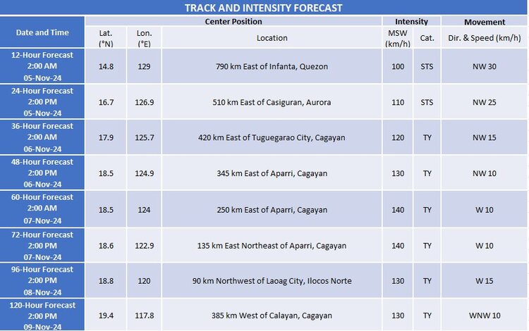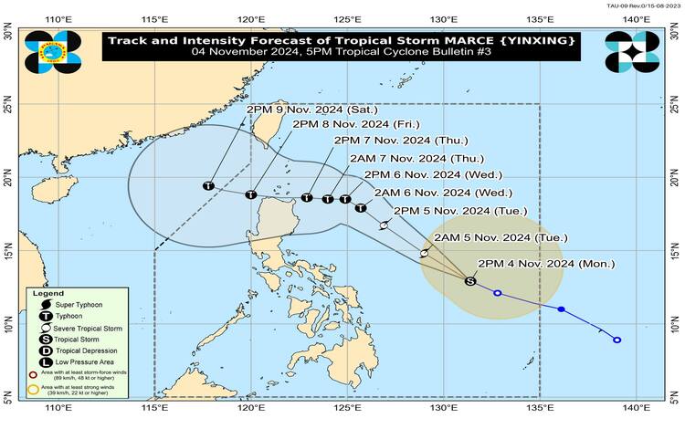 Forecast models suggest that MARCE will continue to move generally west-northwest until tomorrow (November 5) before turning westward at a slower pace over the Philippine Sea, east of Extreme Northern Luzon. Projections indicate that the storm may make landfall near the Babuyan Islands or mainland northern Cagayan on Thursday evening (November 7) or early Friday morning (November 8). There remains uncertainty regarding the strength of the high-pressure area north of MARCE, which could alter the storm’s landfall point.