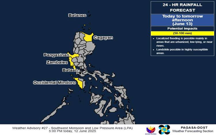 Between today and tomorrow afternoon, June 13, rainfall ranging from 50 to 100 millimeters is expected over several provinces, including Batanes, Cagayan, Pangasinan, Zambales, Bataan, and Occidental Mindoro. PAGASA warned that rainfall totals may be significantly higher in mountainous or elevated areas. Localized flooding and landslides are possible, particularly in areas already saturated by previous rains.