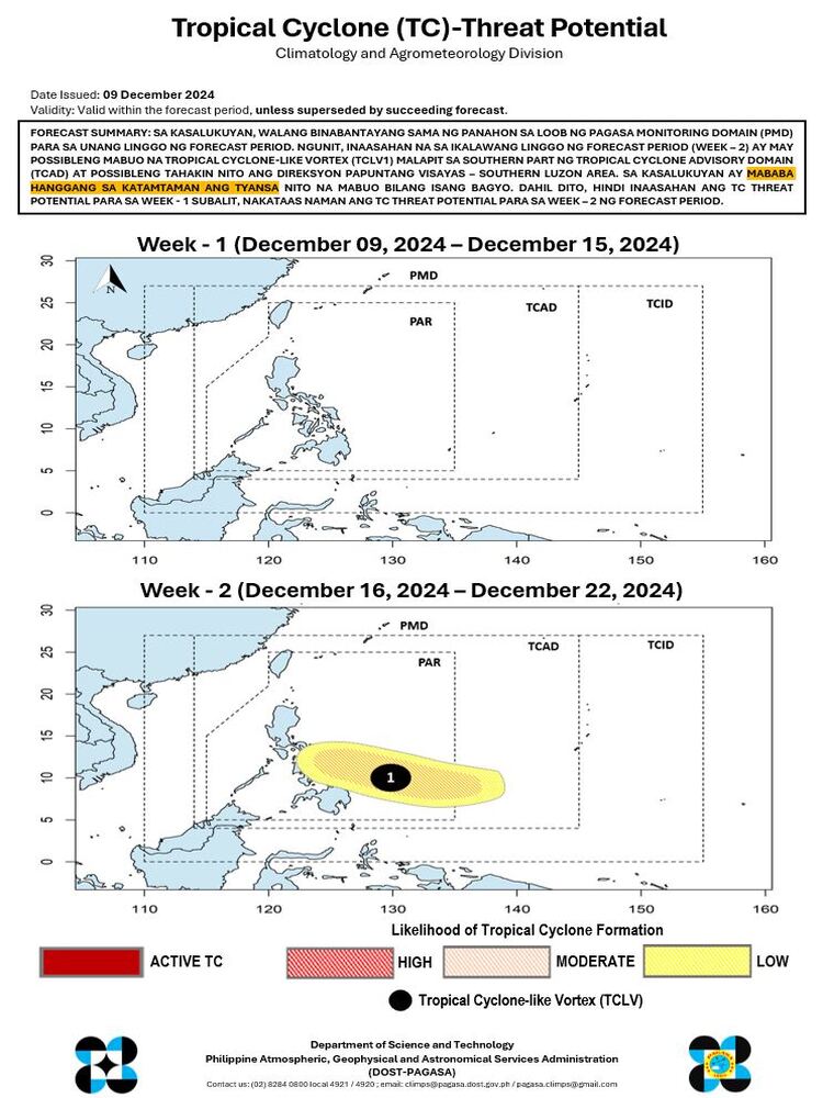 The Philippine Atmospheric, Geophysical and Astronomical Services Administration (PAGASA) released its Tropical Cyclone (TC) Threat Potential Forecast, valid as of December 9, 2024. The forecast provides an overview of expected weather developments within the monitoring domain over the next two weeks.