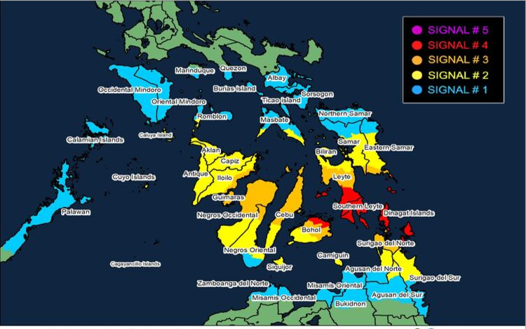 4Typhoon-Force Winds 118 km/hVISAYAS: Extreme southeastern portion of Eastern Samar (Guiuan), Southern Leyte, southern portion of Leyte (Mahaplag, Abuyog, City of Baybay, Inopacan, Hilongos, Hindang, Bato, Matalom, Javier), Camotes Islands, and the northeastern portion of Bohol. MINDANAO: Dinagat Islands, Siargao, and Bucas Grande Islands.