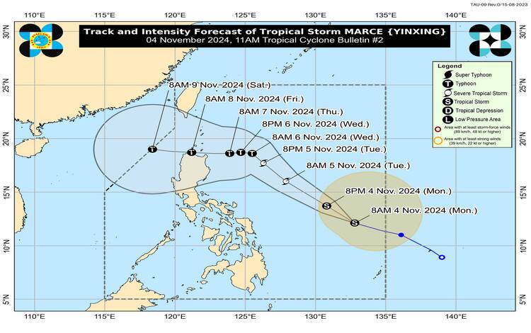 Tropical Storm Marce has recorded maximum sustained winds of 75 km/h near its center, with gustiness reaching up to 90 km/h. The storm is moving at a steady pace of 35 km/h towards the west-northwest and carries a central pressure of 998 hPa. Its current strength may still increase, with PAGASA indicating that Marce could develop into a severe tropical storm by tomorrow, November 5.
