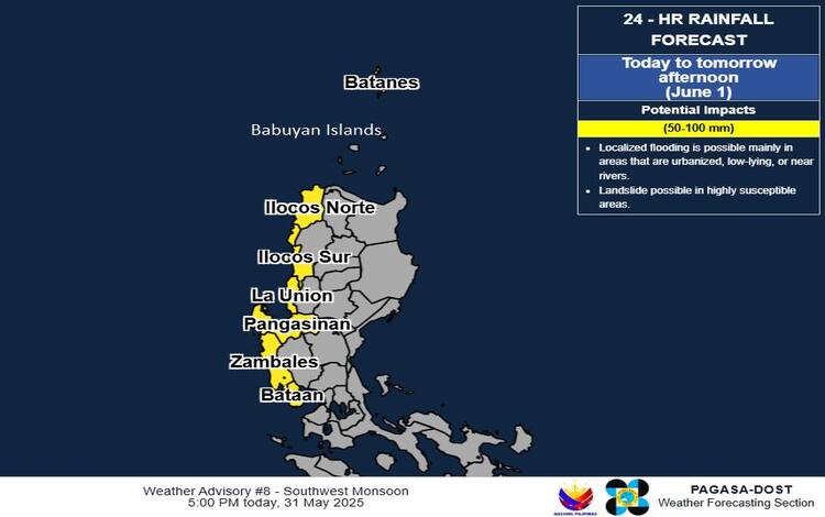 Heavier rains are forecast from Monday noon to Tuesday noon (June 3), with rainfall levels still expected at 50 to 100 mm. This extended forecast includes Ilocos Norte, Ilocos Sur, La Union, Pangasinan, Abra, Benguet, Zambales, Bataan, Tarlac, Pampanga, Batanes, and the Babuyan Islands. PAGASA noted that rainfall could be more intense in mountainous or elevated locations, and the impacts may be worsened by prior rain that has saturated the ground.