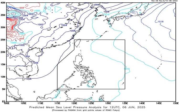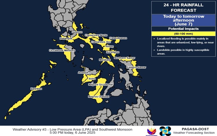 From today until the afternoon of June 7, rainfall amounts of 50 to 100 mm are expected in the provinces of Antique, Iloilo, Occidental Mindoro, Negros Oriental, Negros Occidental, Albay, Camarines, Catanduanes, Masbate, Sorsogon, Palawan, Batangas, Quezon, and Northern and Eastern Samar.